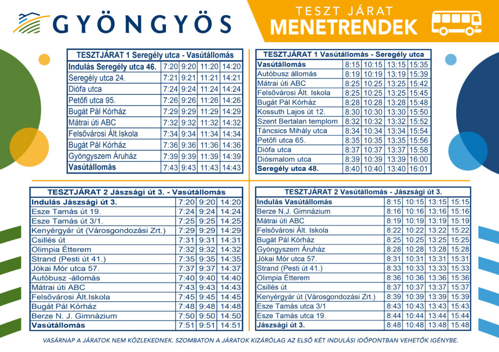 Fontos információ, hogy a járatok vasárnap nem közlekednek, szombaton pedig kizárólag az első két indulási időpontban vehetők igénybe.