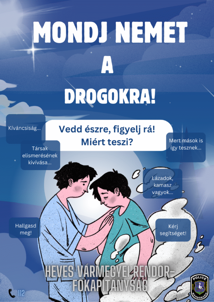 A Heves Vármegyei Rendőr-főkapitányság Bűnmegelőzési Alosztályának plakátja a fiatalok droghasználatának megelőzésére hívja fel a figyelmet. A plakát arra ösztönöz, hogy ne csak a következményekre figyeljünk, hanem az okokat is próbáljuk megérteni. A drogprevenció nem csak tiltás kérdése – a megértés, az odafigyelés és a támogatás legalább olyan fontos.