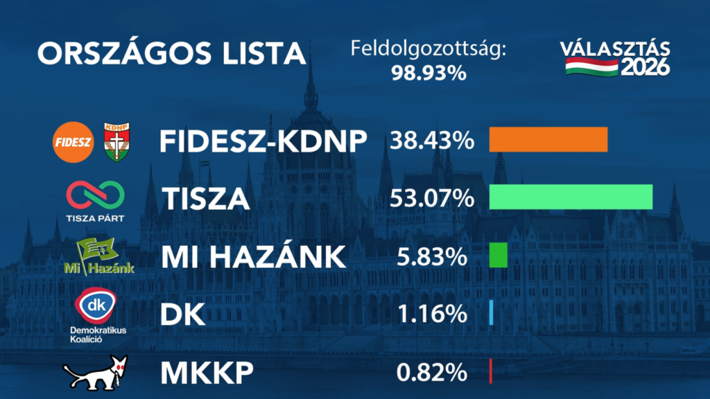 Országosan 98,94%-os feldolgozottságnál a TISZA Párt kétharmados többséget szerzett, 138 képviselőt küldhetnek be a parlamentbe jelen állás szerint. A FIDESZ 55-öt, míg a Mi Hazánk 6-ot.