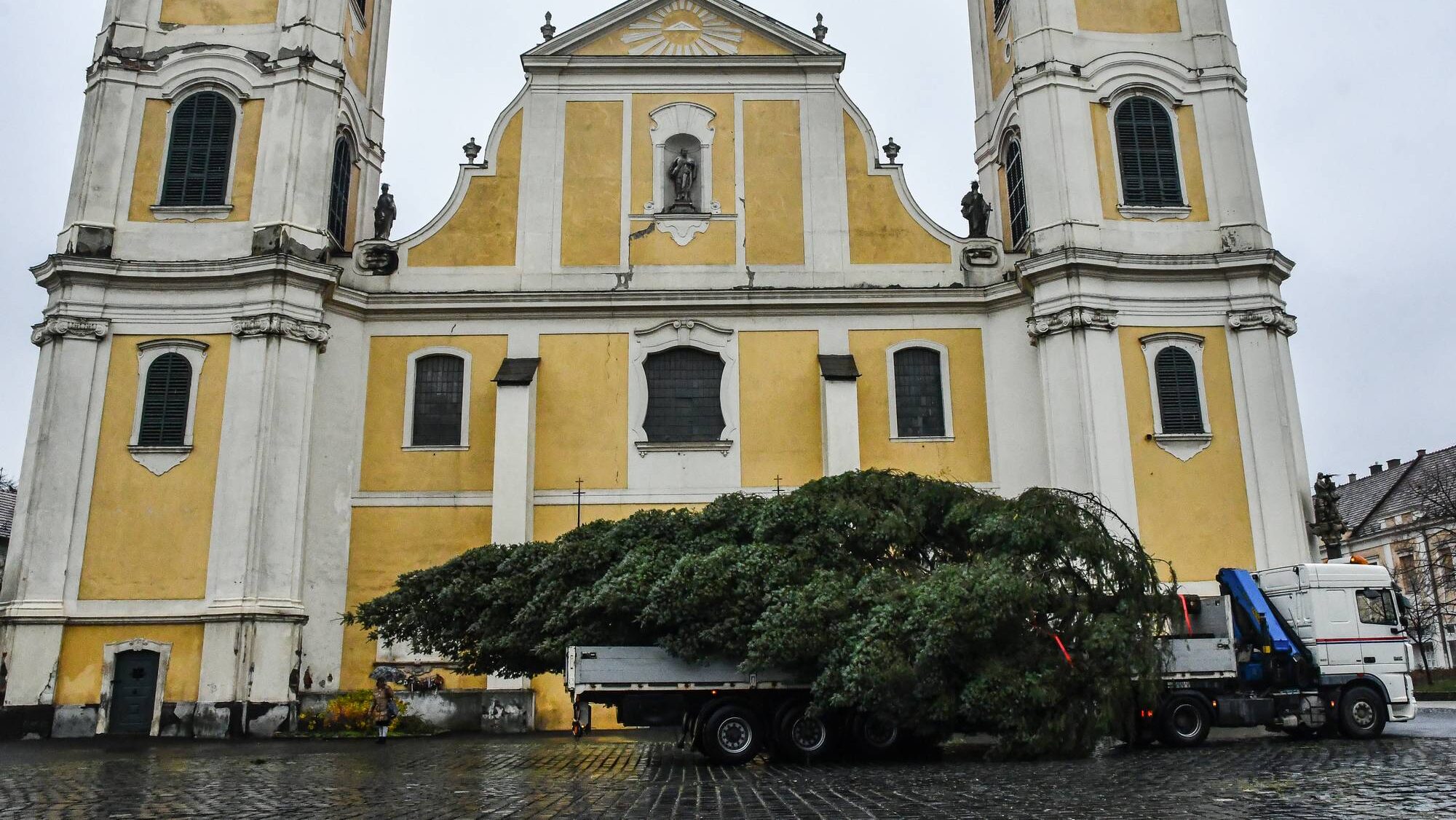 Kedden délelőtt megérkezett a Fő térre mindenki karácsonyfája. A húszméteres fenyőt csütörtökön öltöztetik ünnepi díszbe.