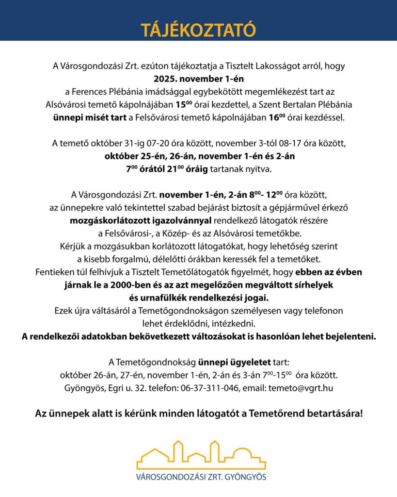 A Városgondozási Zrt. tájékoztatja a lakosságot, hogy 2025. november 1-jén a Ferences Plébánia imádsággal egybekötött megemlékezést tart 15:00 órától az Alsóvárosi temető kápolnájánál, majd 16:00 órától ünnepi mise lesz a Szent Bertalan Plébánia szervezésében a Felsővárosi temető kápolnájában.