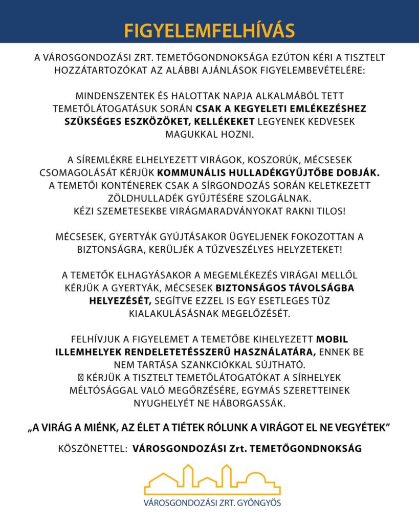 Tisztelettel kérjük, hogy az ünnepek alatt mindenki tartsa be a temetői rendet és segítsük egymást a méltó megemlékezésben.