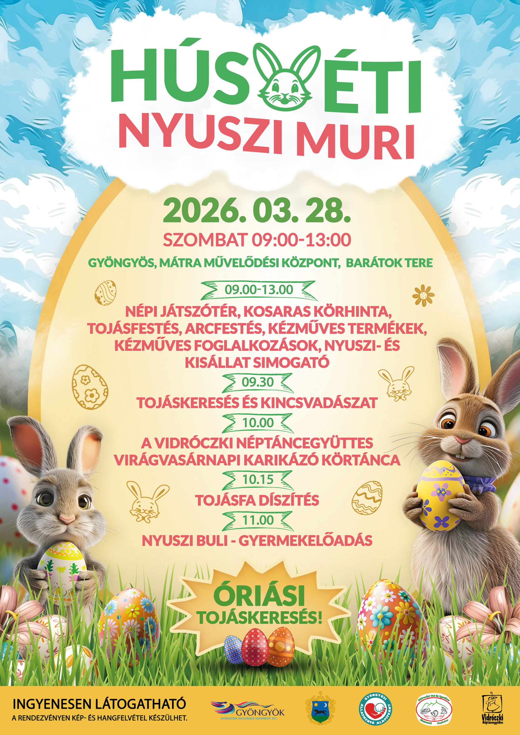 Népi játszótérrel, kosaras körhintával, kézműves foglalkozásokkal, kincskereséssel, arcfestéssel és csillámtetoválással, nyuszi- és kisállat simogatóval, továbbá kézműves termékekkel várunk kicsiket és nagyokat!