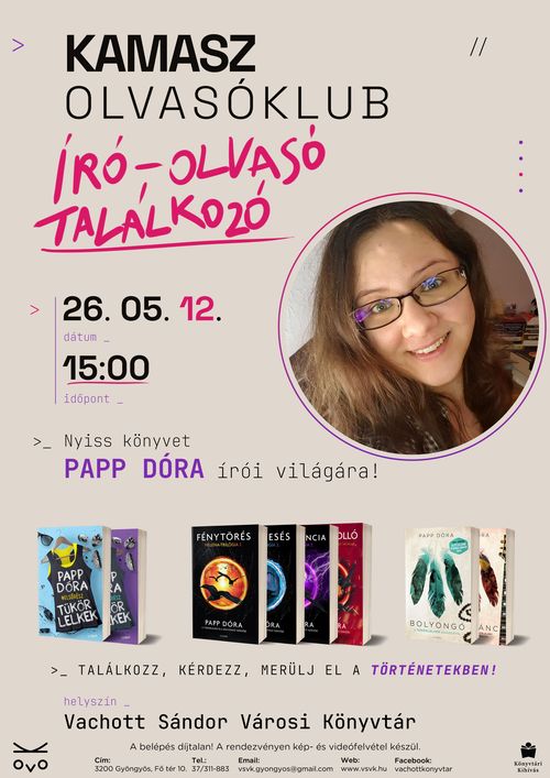 Nyiss könyvet Papp Dóra írói világára! Kamasz olvasóklub: Író-olvasó találkozó a Vachott Sándor Városi Könyvtárban!