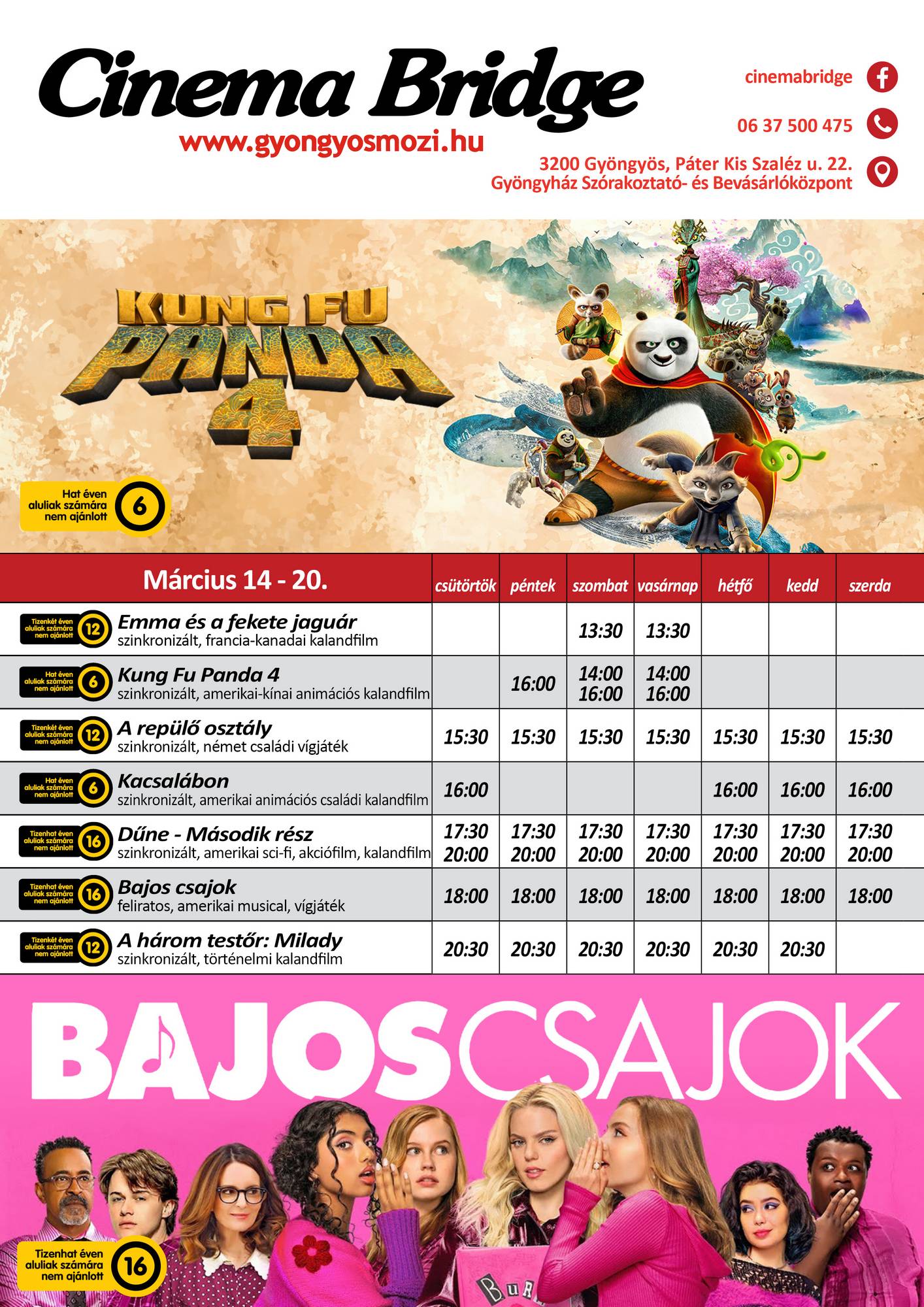 Home Eseménynaptár Moziműsor dátum 2024. márc. 14. - 20. - csütörtök - szerda Expired! időpont All Day Moziműsor A Cinema Bridge mozi műsora. Share this event + Google Naptárba mentés + iCal / Outlook export The event is finished.
